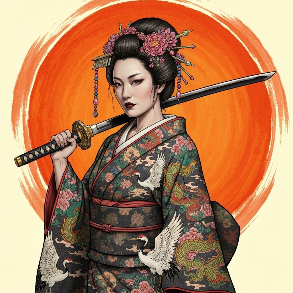 This image shows a Japanese warrior woman in a dark floral kimono, holding a katana. Her hair is styled elegantly, and her expression is fierce. The background features a bold orange sun, rendered in a style reminiscent of classic ink illustrations.