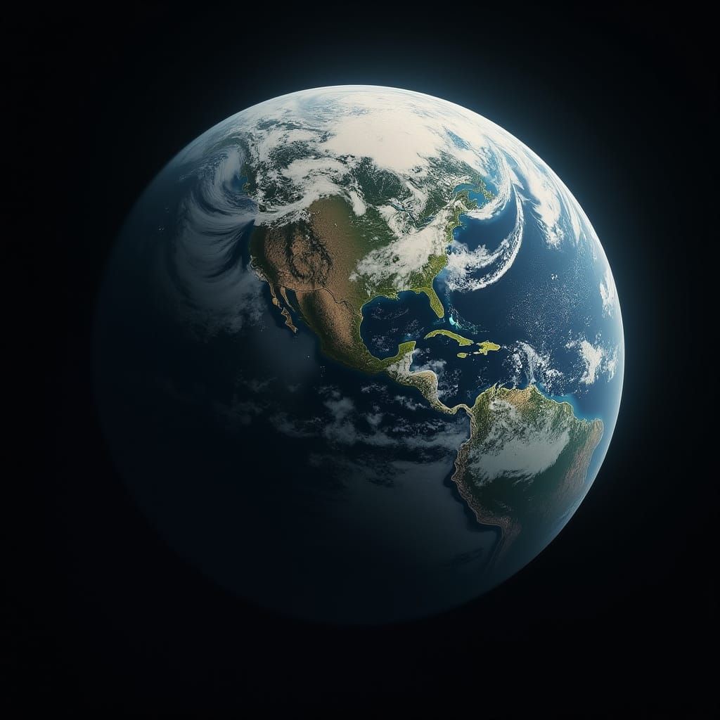 A digital painting shows planet Earth suspended in the void of space. Swirling clouds and oceans are visible on the planet's surface, set against a background evoking cosmic wonder.