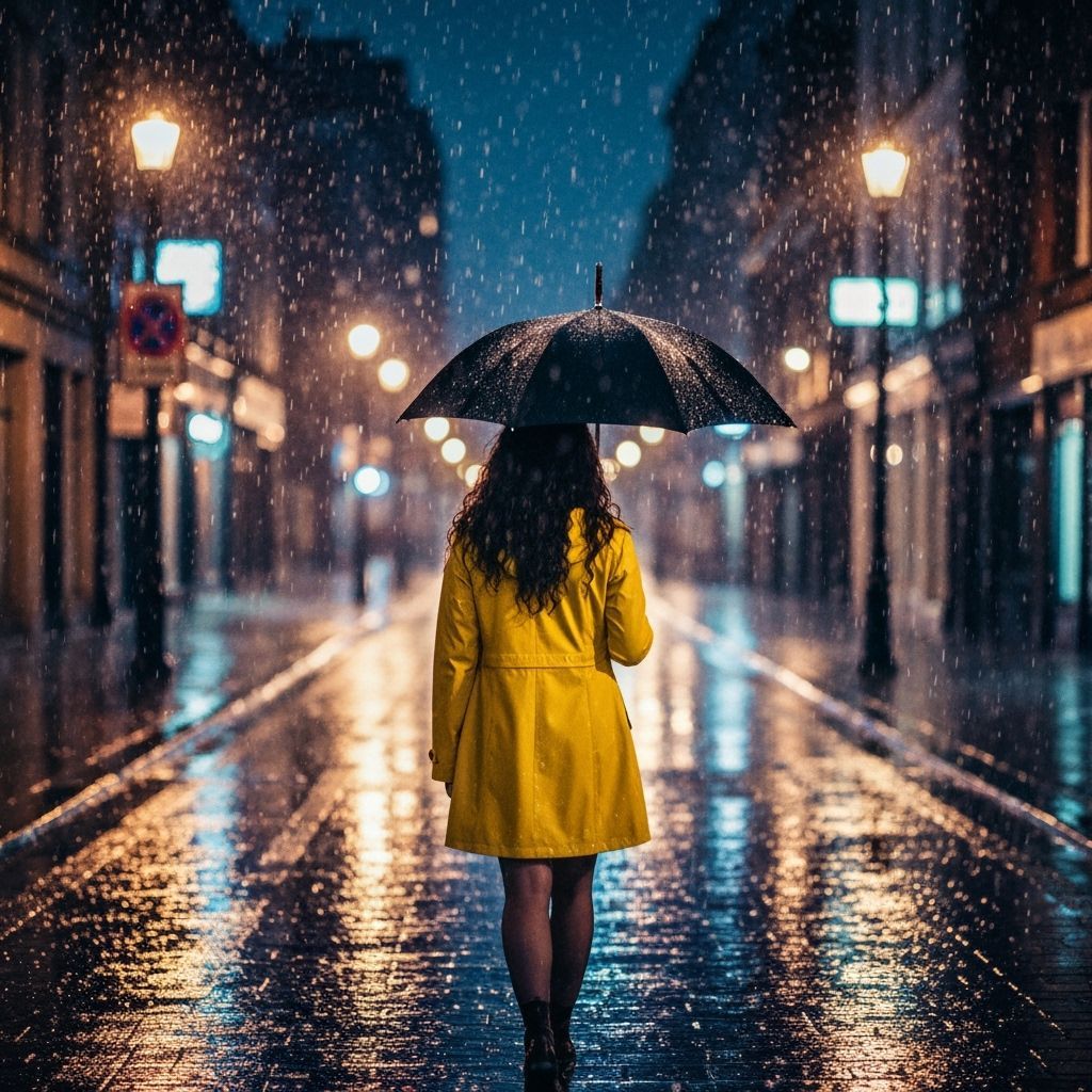 This image shows a woman with curly hair in a yellow raincoat walking on a rainy street at night. The rain creates a kaleidoscope of fractal colors, with streetlights reflecting off the wet pavement, rendered with motion blur, and a vintage film aesthetic.