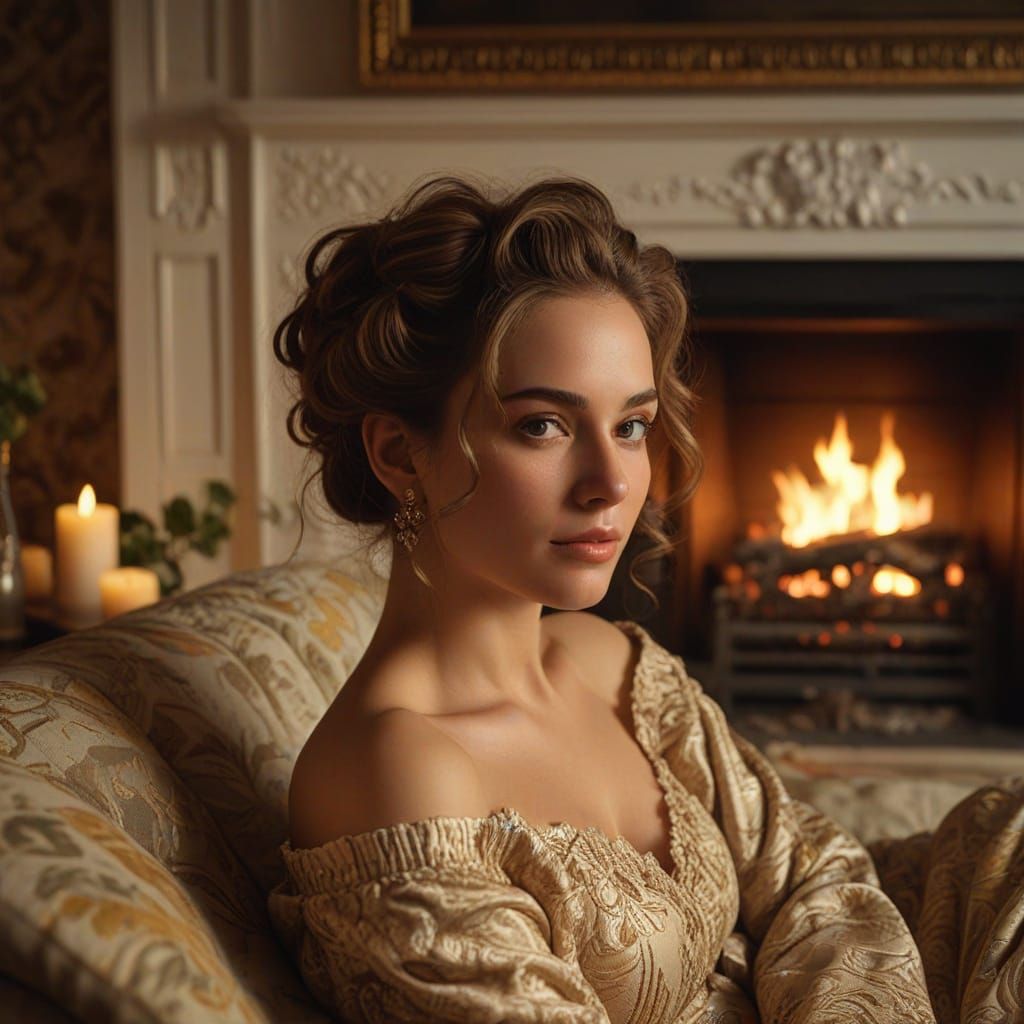 This image shows a woman in a warmly lit room. The close-up portrait captures a cinematic style with soft golden lighting. Floral patterns and luxurious decor add to the elegant, cozy ambiance.