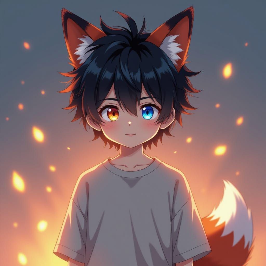This image depicts an anime boy with fox ears, a tail, and striking heterochromatic eyes. Created in a dynamic, cel-shaded anime art style with dramatic lighting and glowing embers.