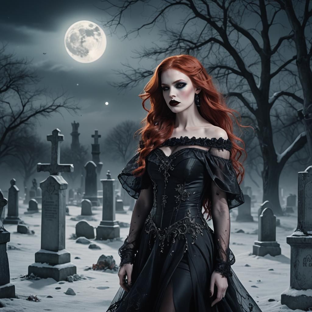 This image shows a dark fantasy scene of a goddess in a snow-covered graveyard. The matte painting style features deep blues and purples contrasting with fiery reds, accentuated by dramatic lighting.