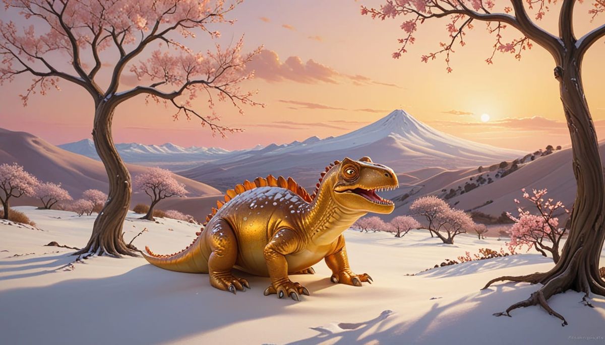 A striking picture of a baby dinosaur trapped inside a giant piece of amber. The amber sits in a snowy landscape with a surreal almond tree in bloom, rendered in 3D art.
