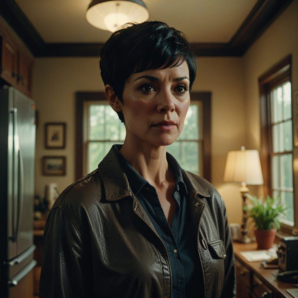 This cinematic film still captures a 47-year-old American woman with a short pixie cut. Shot with film grain and soft lighting, it evokes quiet contemplation.