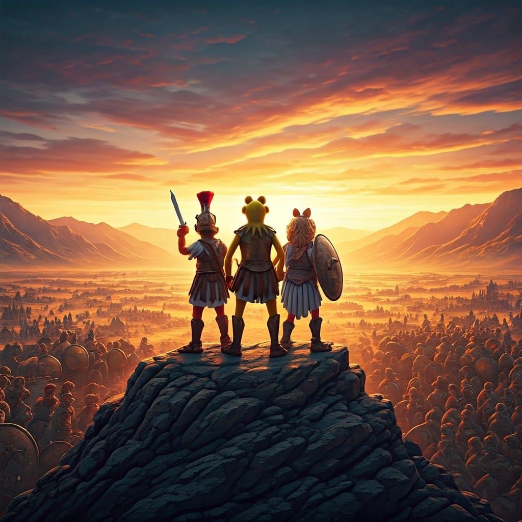 This image depicts Kermit and the Muppets standing heroically amidst an ancient Greek battle, set against a breathtaking, fiery sunset, with majestic mountains and rolling hills in the background, showcasing rich colors and intricate textures reminiscent of a dramatic epic.