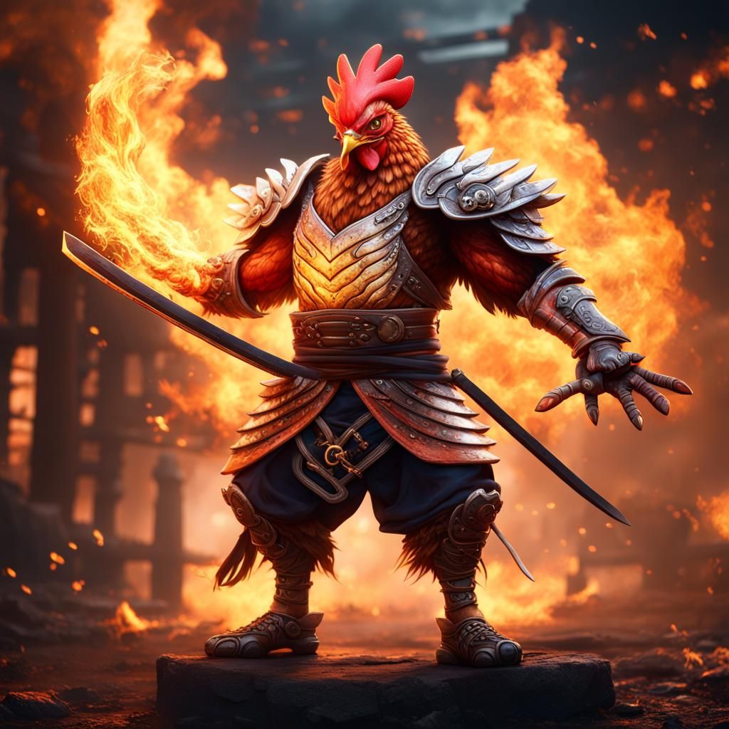 This image shows a muscular chicken fighter with glowing fiery eyes holding a samurai sword. It is a detailed matte painting with deep colors and intricate details in a fantasy concept art style.