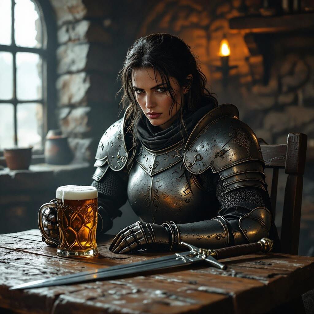 A lone knight in worn armor sits at a wooden table in a dimly lit tavern, with a tankard of ale and her sword nearby. The scene features dramatic shadows and intricate textures.
