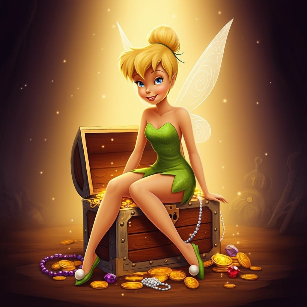 This image features Tinkerbell sitting on an opened pirate treasure box, surrounded by golden coins and jewelry, with bursts of light in a whimsical cartoon style reminiscent of classic animation.