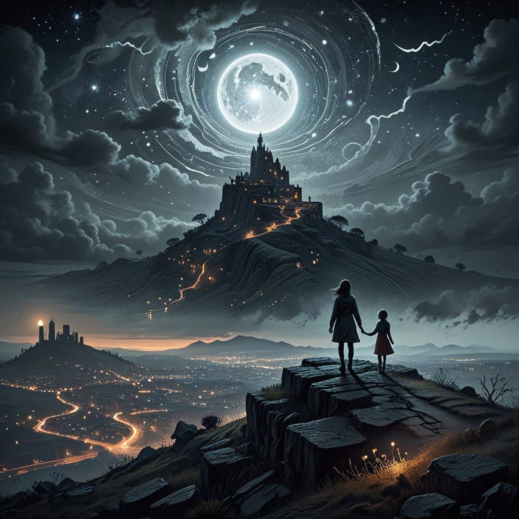 A detailed line drawing of a lone figure on a hill observing a skyline. The sky is filled with cosmic energy, rendered with aquatint textures and dramatic lighting in a surreal style.