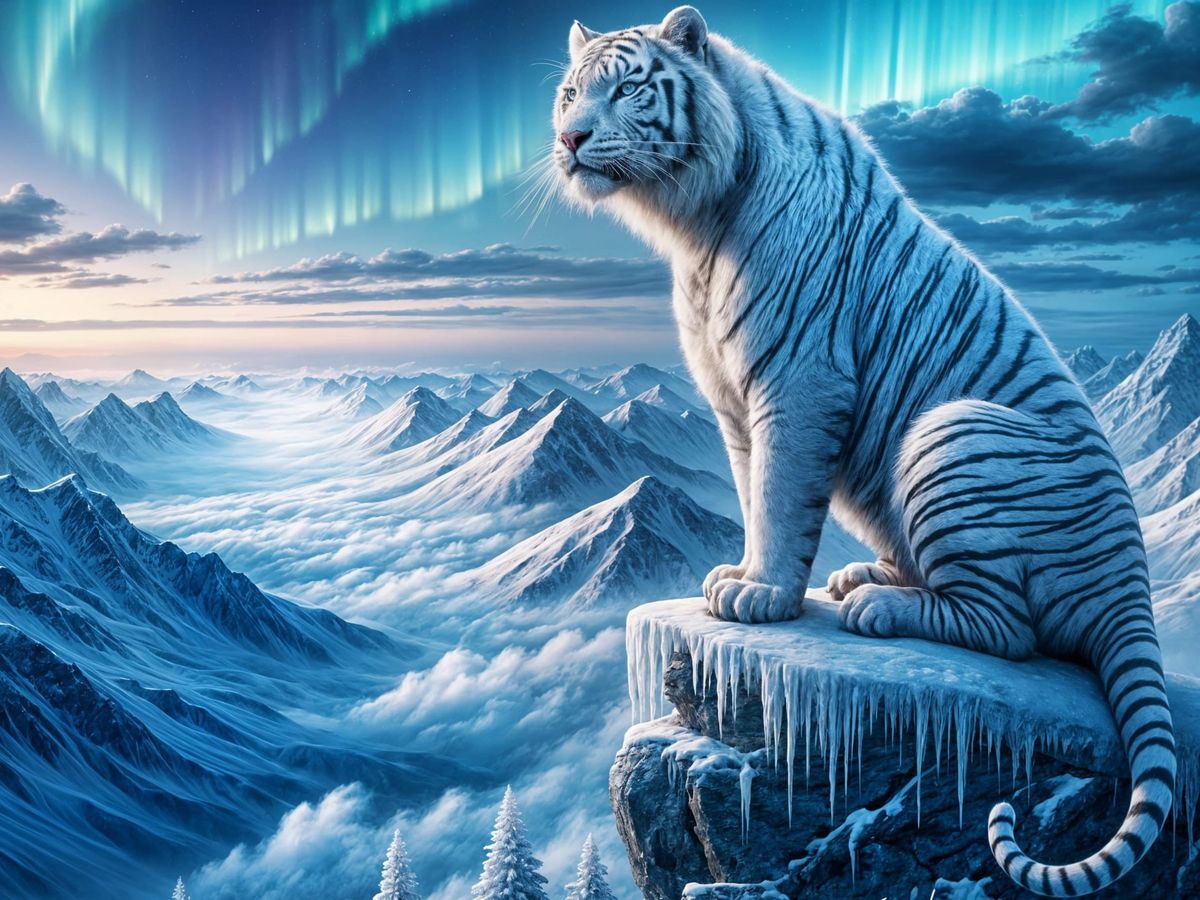 This image shows a majestic white Bengal tiger standing on a frozen mountain peak, its blue eyes gazing out over a vast winter landscape. The tiger's fur shines in the soft light, set against a breathtaking sky of blues and purples, with subtle auroras dancing at the horizon.