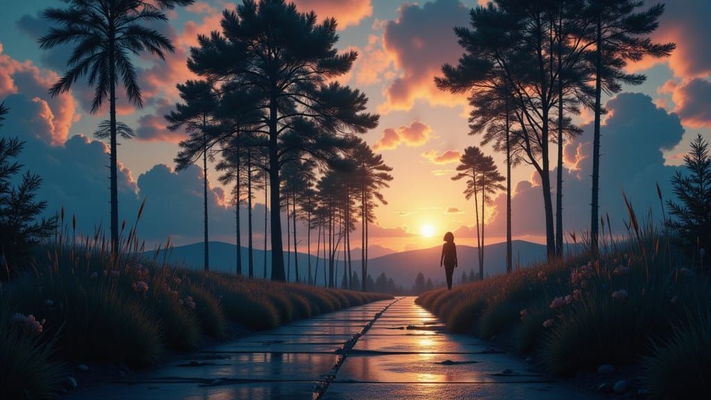 This image shows a solitary figure in a head and shoulders portrait on a dimly lit path. The art features dynamic lighting with muted blues, soft oranges, and deep purples, rendered in a hyperdetailed concept art style.