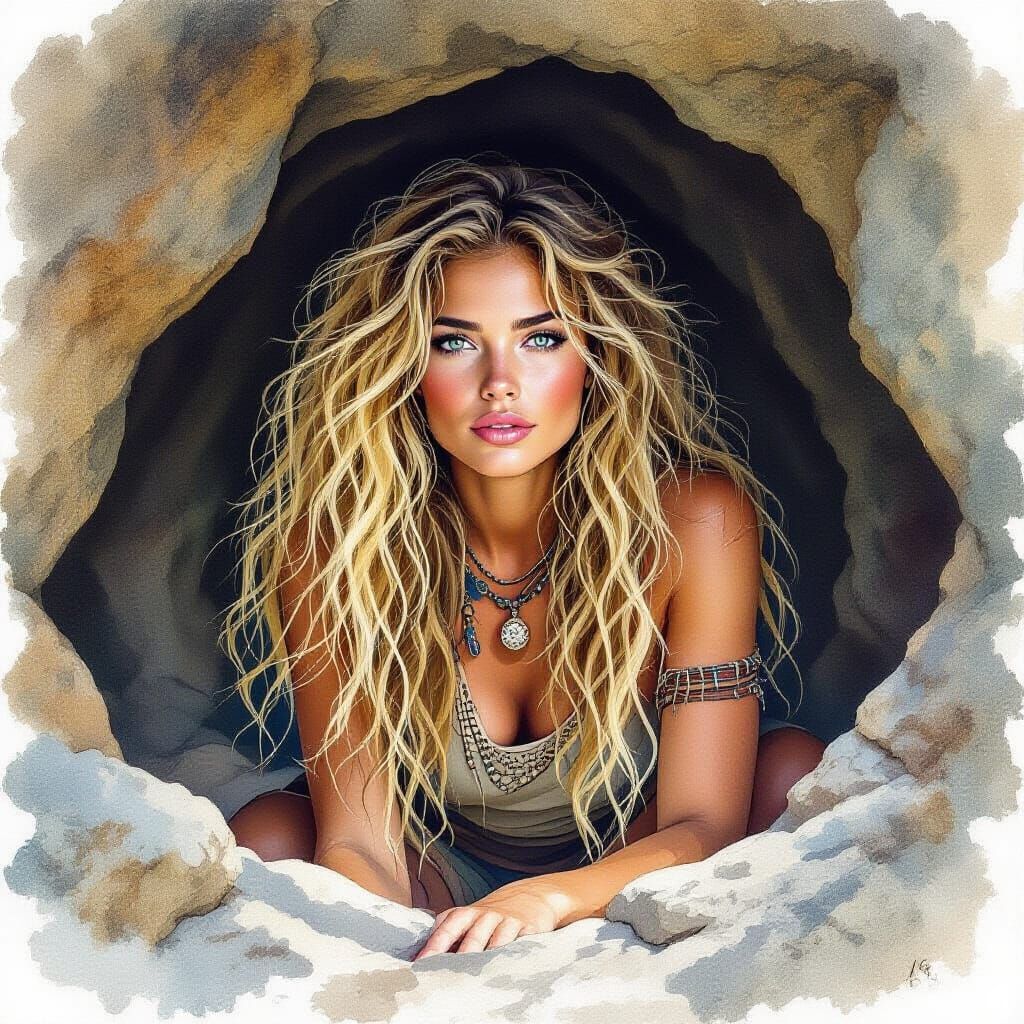 This watercolor painting depicts a prehistoric woman with long, messy blonde hair, situated within the confines of a cave.