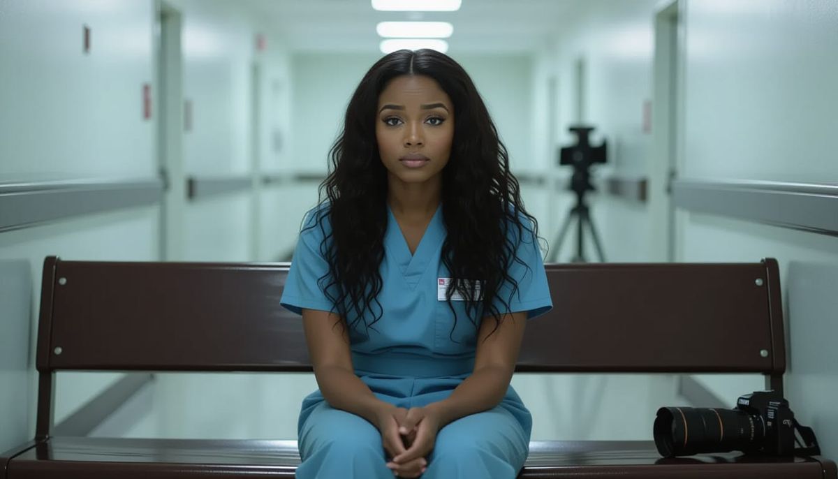 A cinematic image of a young Black woman with curly hair and blue eyes sitting on a bench. She's wearing a nurse's uniform in a dimly lit hallway, conveying solitude and quiet emotion with cool tones.