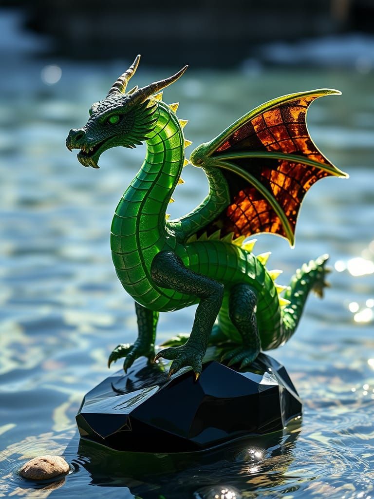 This image showcases a photorealistic sculpture of a dragon made from smooth green and black sea glass, detailed with sun glints. Macro photography highlights intricate textures.