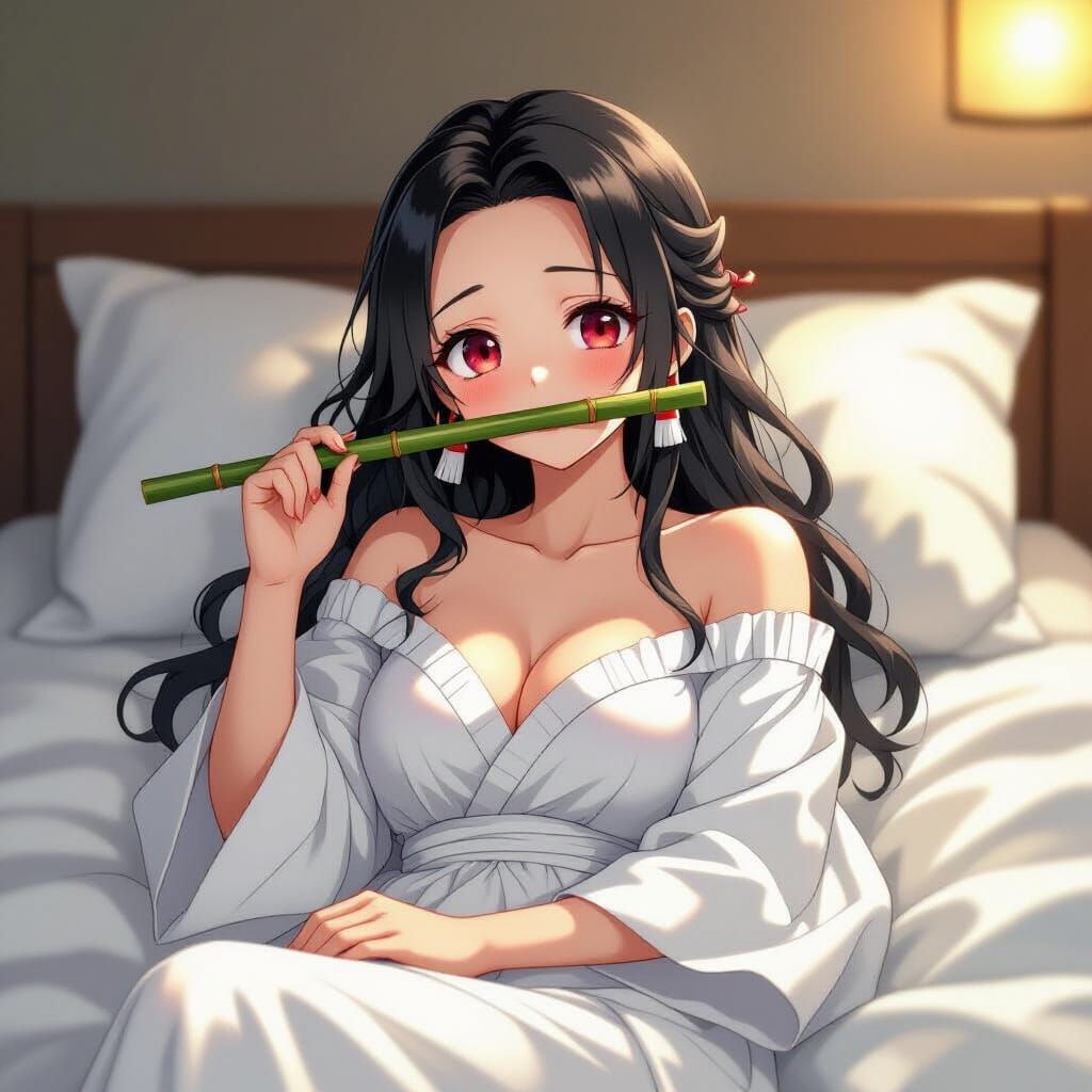 This image portrays Kamado Nezuko in an off-shoulder dress, lying on a bed and biting a bamboo stick. The character is bathed in soft sunlight, rendered in detailed 3D CG style.
