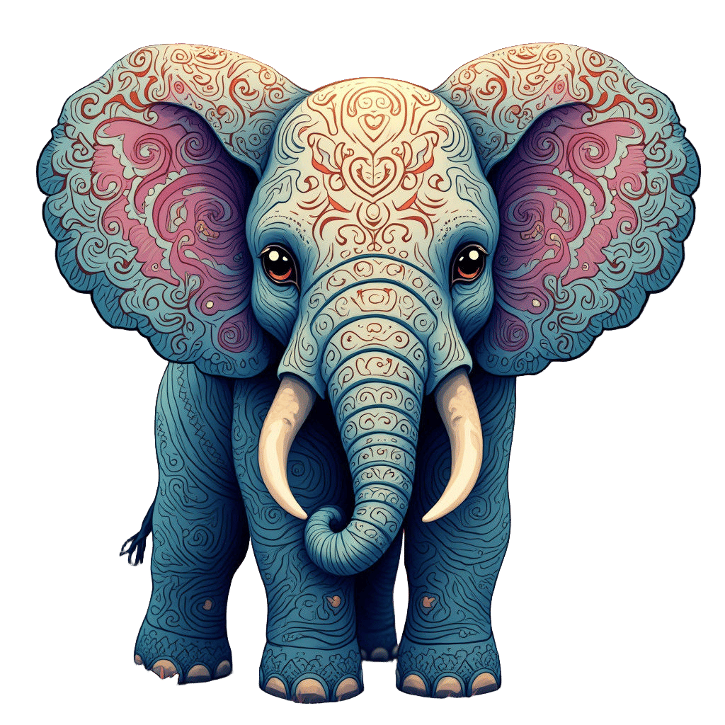 A cute anime-style mother elephant rendered with abstract vector fractal techniques. The image features wave function and Zentangle elements, enhanced with 3D shading.