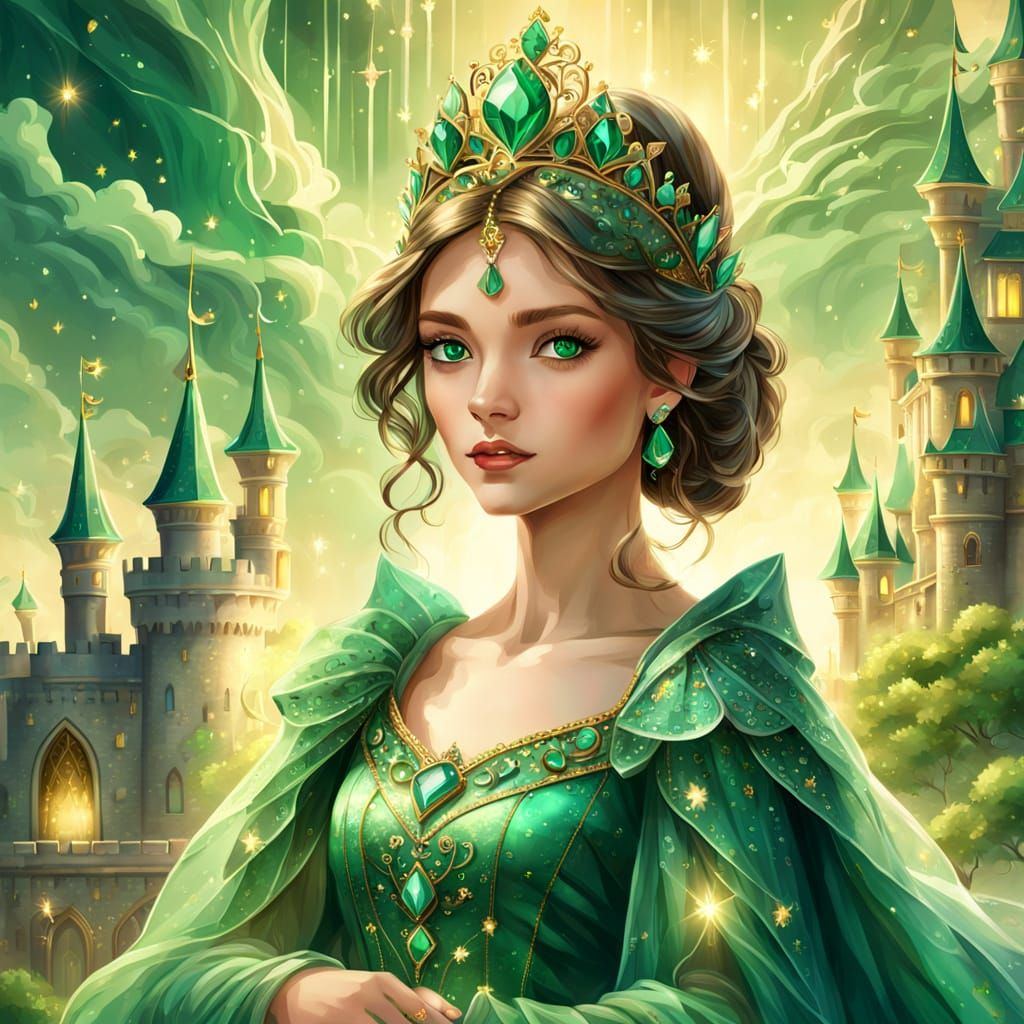 A digital painting of a princess in an emerald dress and jeweled tiara, set against a misty castle backdrop. The image is rendered in a whimsical fantasy style.