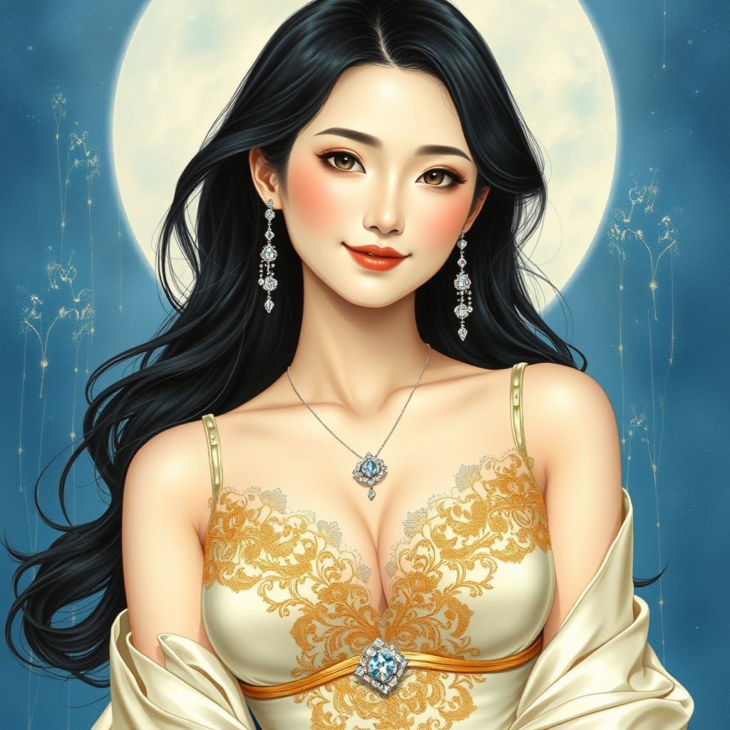 This image shows a serene and confident Japanese woman adorned in luxurious cream and gold silk, with delicate lace and sparkling diamond jewelry, set against a soft blue fantasy background that evokes the dreamy quality of a Rie Hosokai painting.