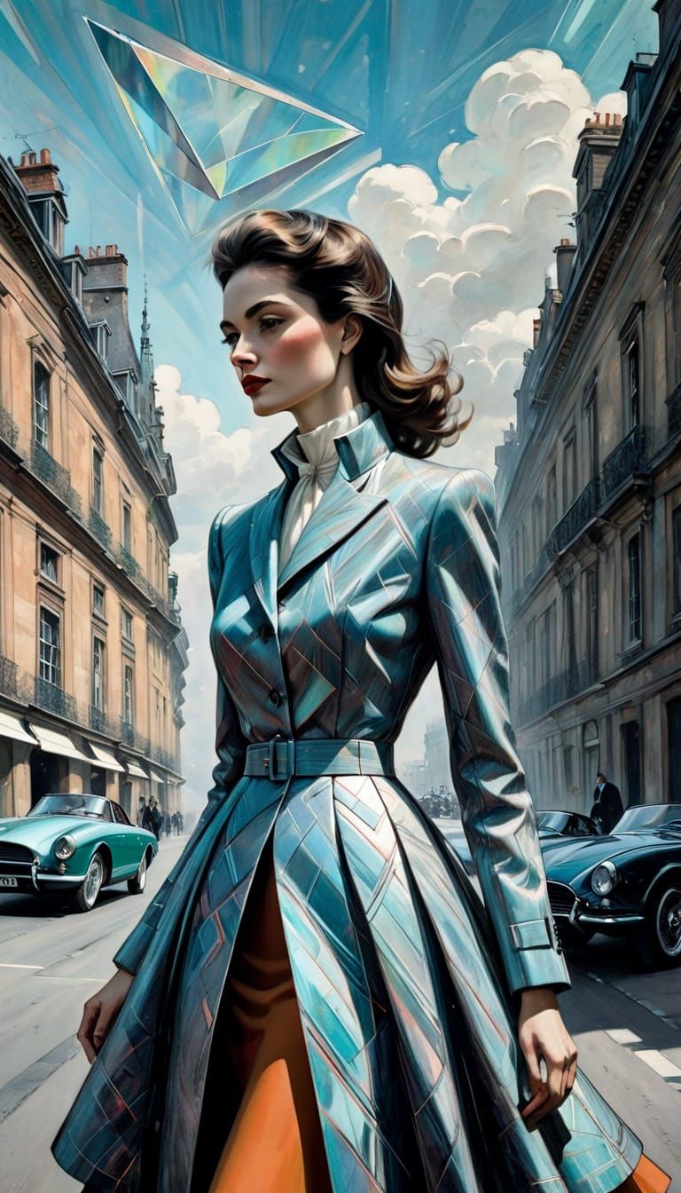 This image shows a dreamscape in the style of Norman Cornish, featuring a dazzling sky and layered geometry. The artwork uses bold colors and chiaroscuro lighting in a rococo aesthetic.