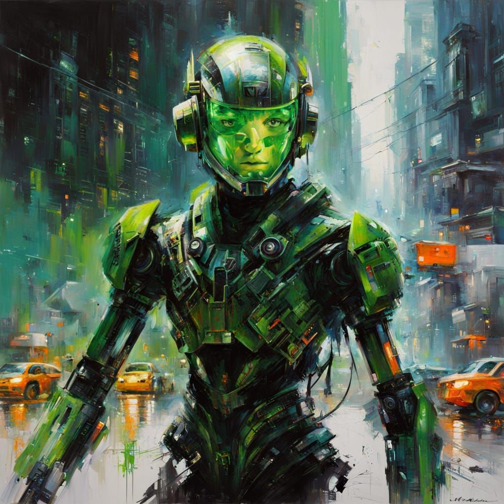 This image shows a striking cyborg figure standing amidst a futuristic city, with vibrant blacklight neon lights and sharp contrast, painted in a style reminiscent of visible brush strokes.