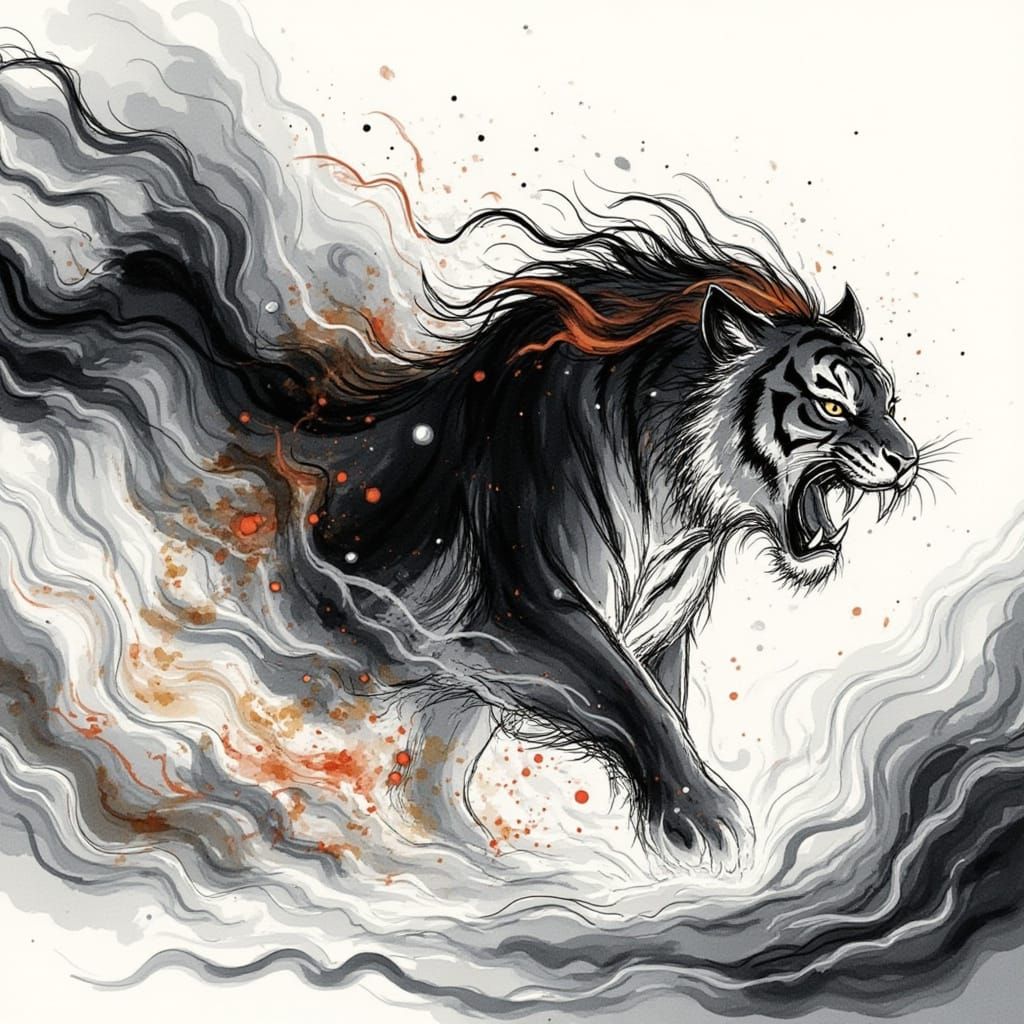 This image features a powerful tiger depicted in a classic monochrome ink wash style, with bold strokes and subtle washes. Accents of crimson and gold add a vibrant contrast.