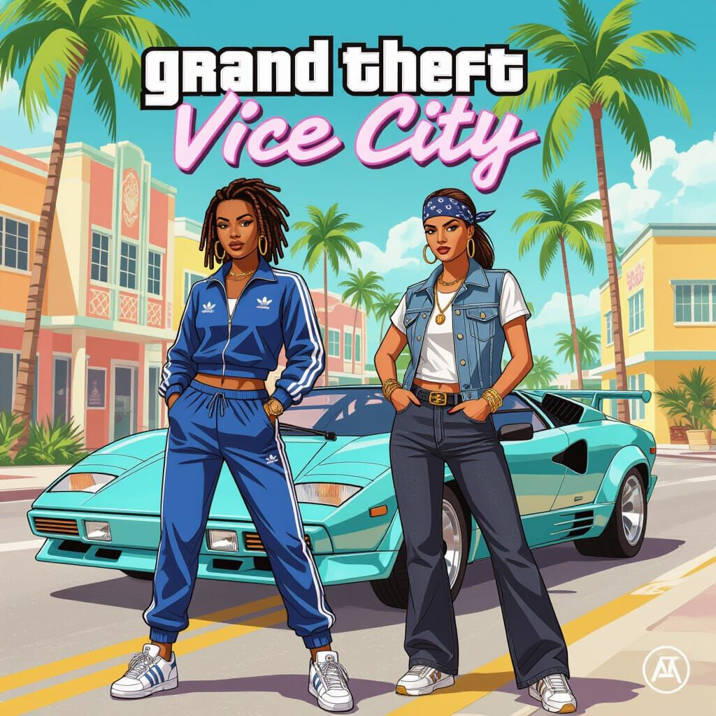 Easily generate your own vibrant, cinematic posters in the style of Grand Theft Auto: Vice City. Free and simple AI image creation.