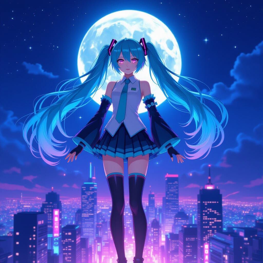 This digital art showcases a colossal Hatsune Miku dominating a nighttime city, bathed in neon and moonlight. Her luminous hair and sparkling eyes create an ethereal, retro-futuristic scene.