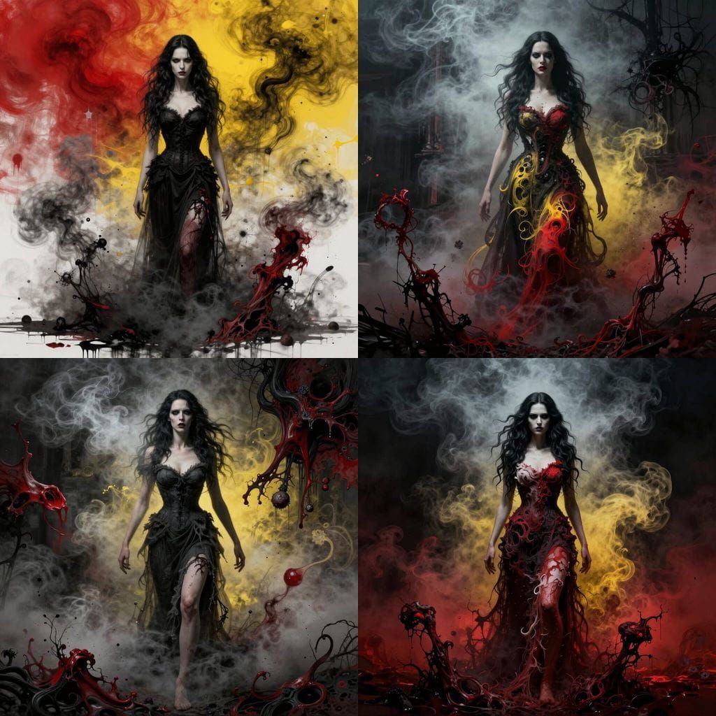 This image depicts a towering, ill-tempered woman amidst swirling smoke and abstract collage elements. Features a striking color gradient of crimson, yellow, and vanta black.