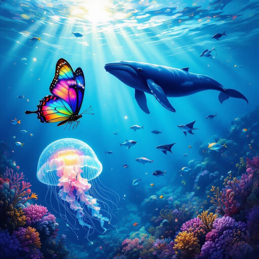 Design your own underwater worlds with butterflies, jellyfish, and whales. Free and easy AI image generation.