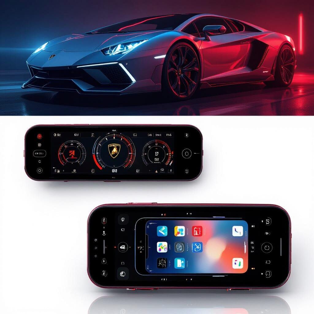 This image shows a Lamborghini interior at night, illuminated by red and blue lights. The dashboard, steering wheel logo, and console with a docked iPhone are visible in a futuristic, 3D rendered style.