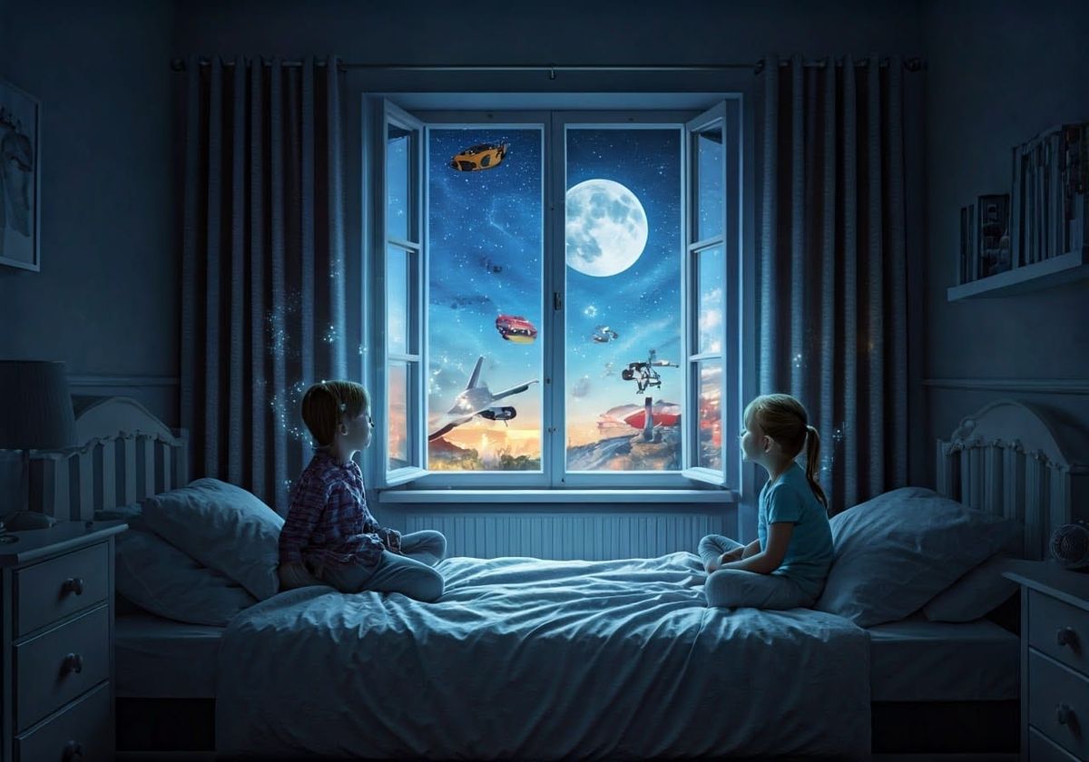 This image captures a surreal scene where children's dreams blend with fantastical elements, as cartoon characters, sports cars, and airplanes fill the room through an open window, set against a backdrop of a bright moonlit night.