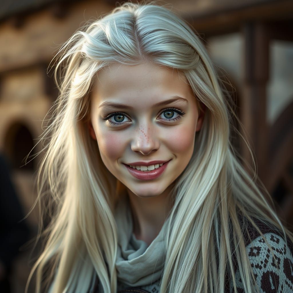 A young woman with striking features and boyish charm stands amidst medieval scenery, captured with the softness of natural lighting and the depth of a professional photographer's eye, creating a dreamlike atmosphere reminiscent of fine art photography