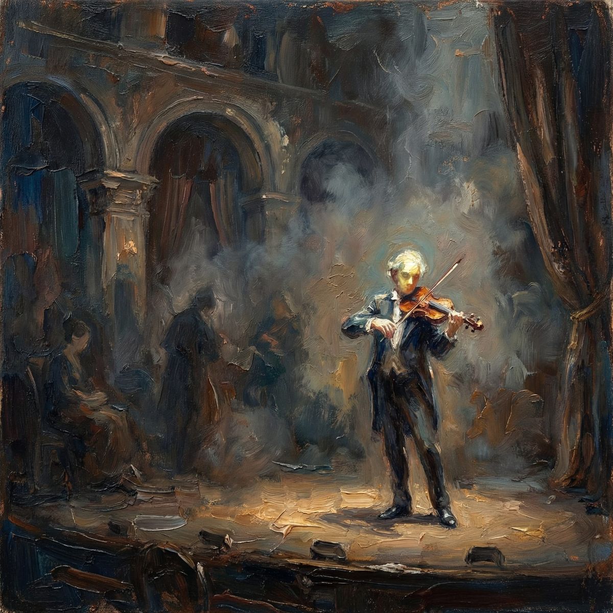 A lone violinist performs under a dramatic spotlight in a smoky concert hall, rendered as a detailed impasto painting with expressive brushstrokes and moody colors.