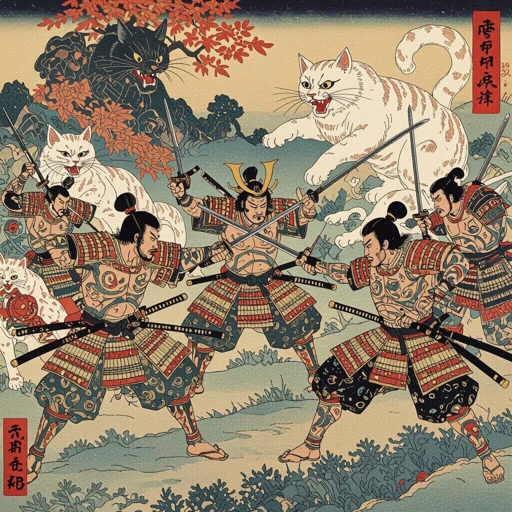 This image depicts an epic samurai battle with surreal elements, featuring warriors with extra limbs and spectral cats. The art style blends traditional ukiyo-e colors with dreamlike distortions and impossible anatomy.