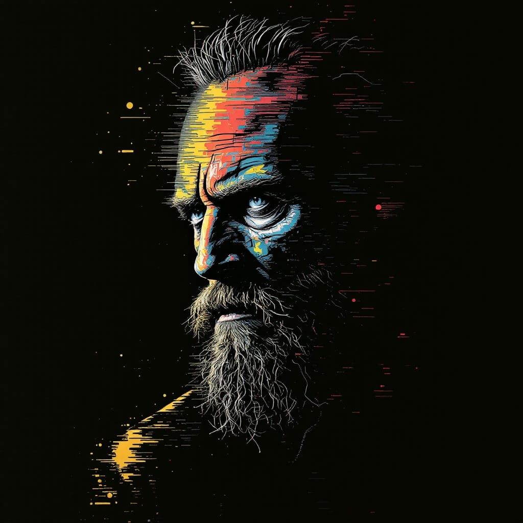 This image combines the dramatic lighting of a Rembrandt painting with the bold energy of Keith Haring's street art, featuring vibrant primary colors and strategic pixel fragmentation.