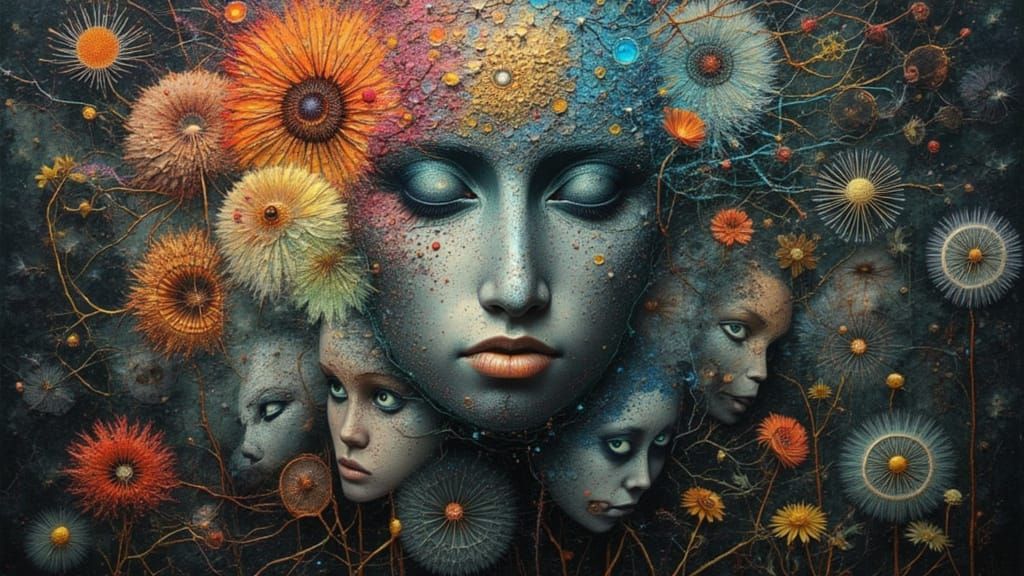 This image visualizes a mindscape where emotions manifest as diverse faces surrounding a central, contemplative figure. A chaotic, beautiful blend of feelings rendered in high-resolution digital art.