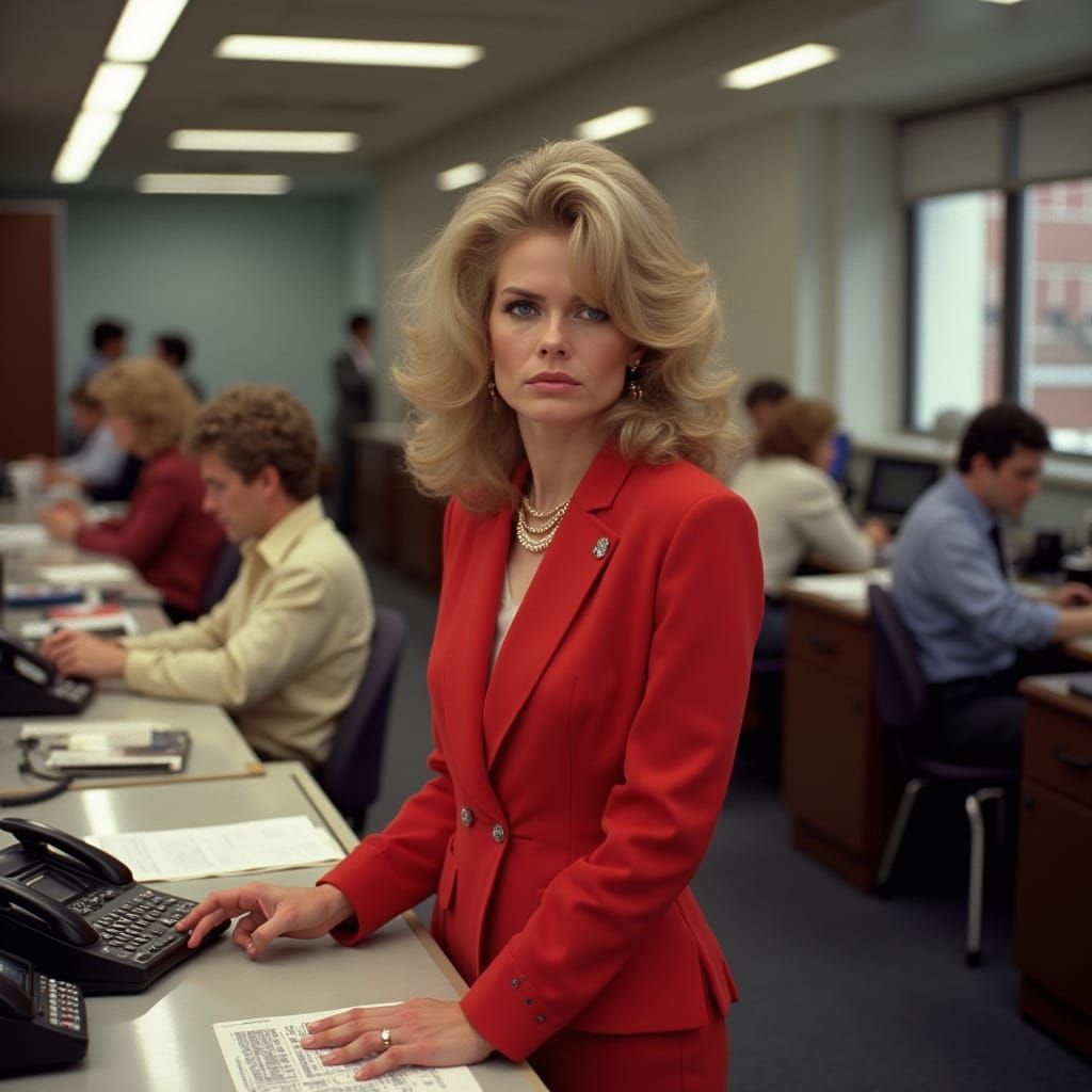 This image captures the essence of 80s pop culture, with a nostalgic newsroom scene featuring a bold, red-jacketed Corky, surrounded by vibrant colors and the hum of activity, as if frozen in time by a master photographer like Annie Leibovitz.