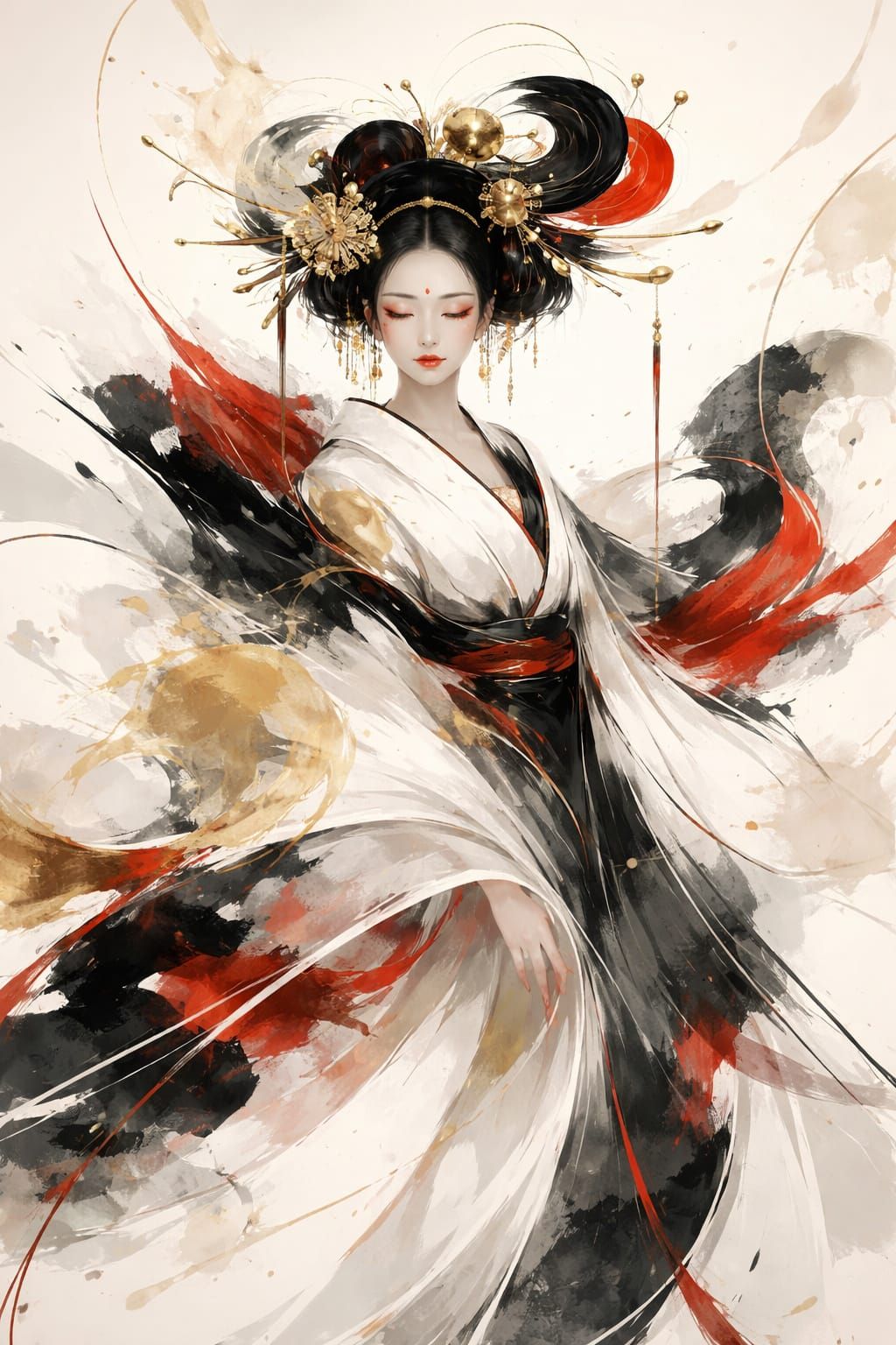 This image features a minimalist depiction of a goddess, blending abstract elements with a geisha's serene presence.