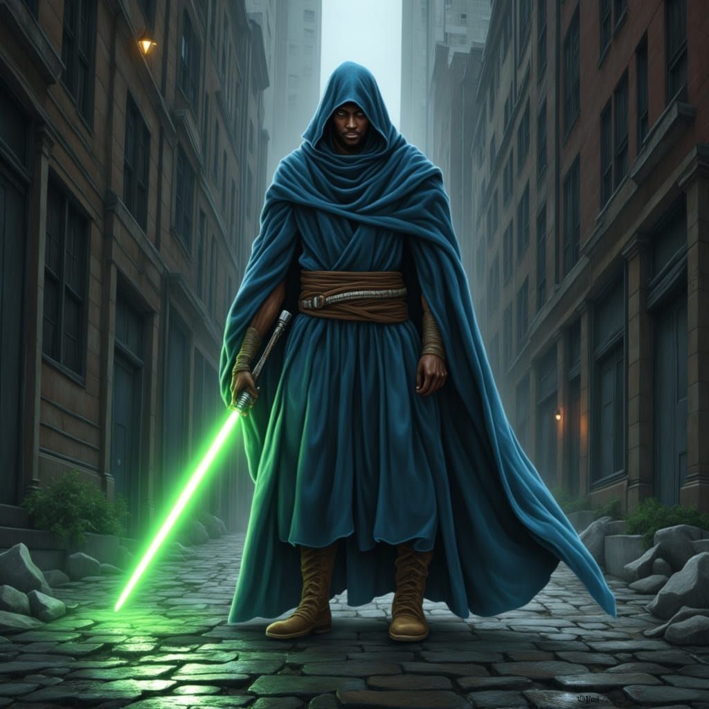 A lone Jedi in blue robes stands in a dark alleyway, green lightsaber drawn. The scene blends sci-fi and fantasy with a gritty, concept art aesthetic.
