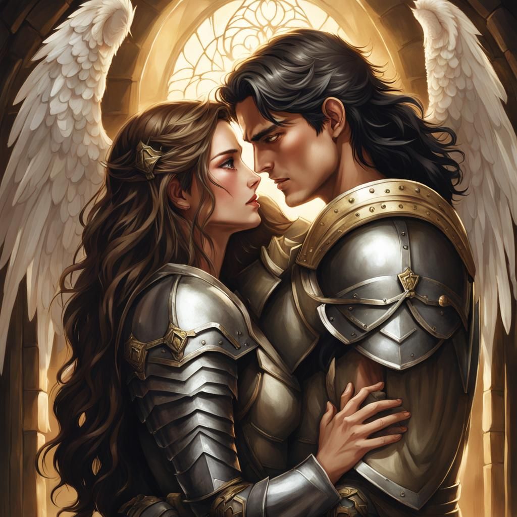 A crying mid-twenties human female with pale skin and long dark wavy hair wearing armor hugs a male angel with ash blonde messy hair and warm ivory skin in armor located in a stone hallway