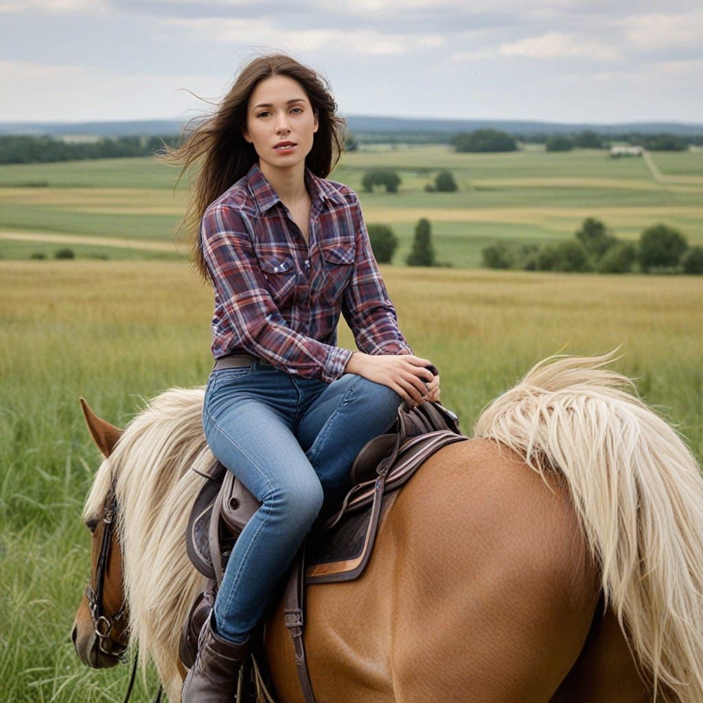 This image depicts a woman in casual attire, seated on a horse, gazing across an expansive rural landscape. The artwork captures a serene, pastoral scene.