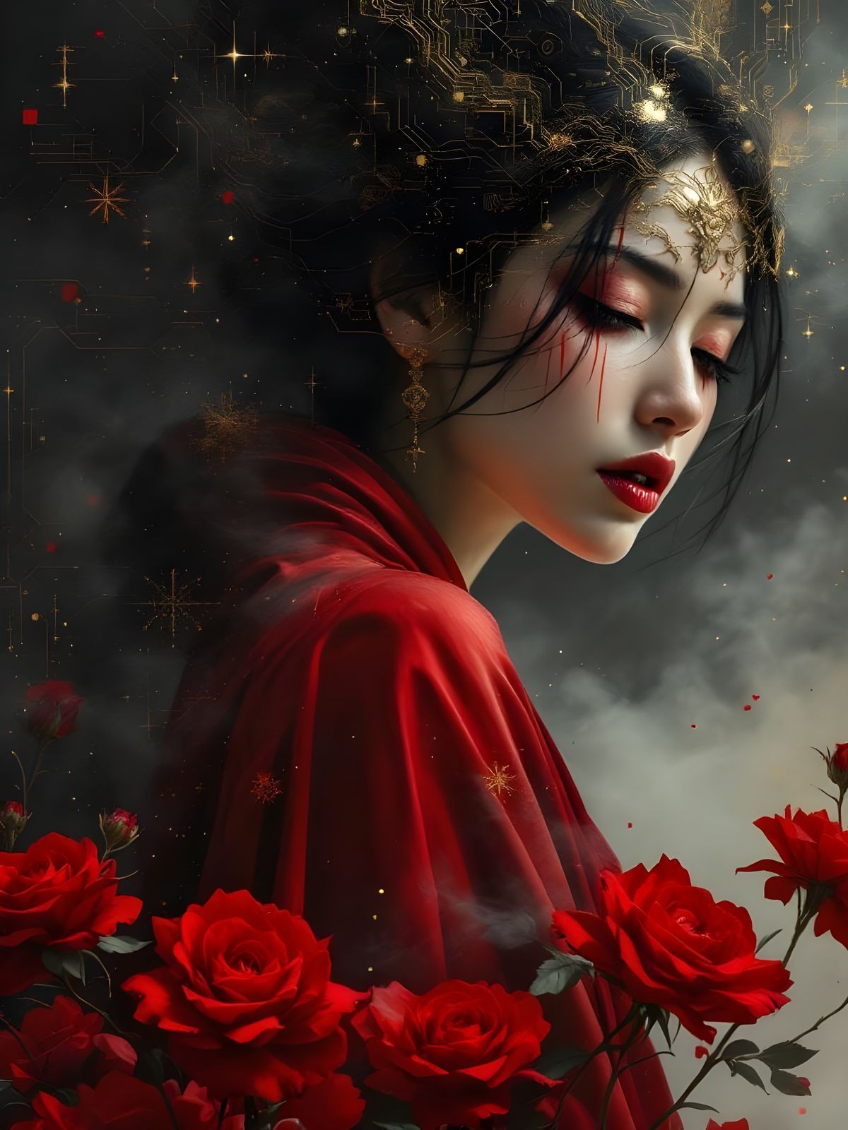 A striking picture of a woman in a fusion of Eurasian and cyberpunk aesthetics. Digital currents and neon lights blend with baroque elements in this futuristic image. The artwork evokes a sense of sacred beauty and ancient symbolism.