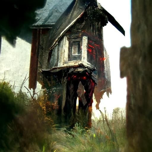 This image shows a sinister cottage core scene. The artwork features detailed fantasy art elements and a dark, moody atmosphere, reminiscent of Greg Rutkowski's style.