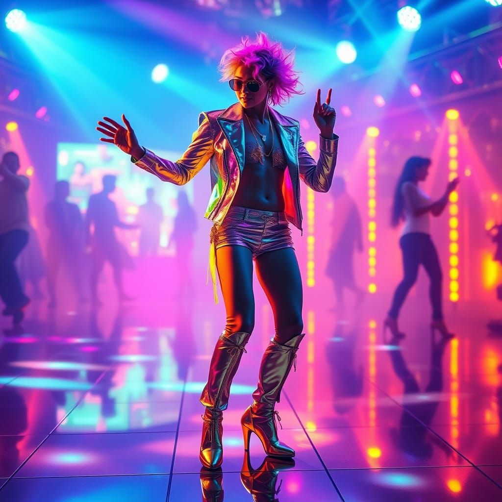 A digital rendering of a disco dancer in a flashy outfit, dancing on a luminescent dance floor. The image has dynamic energy and vibrant neon colors, in a retro-futuristic style.