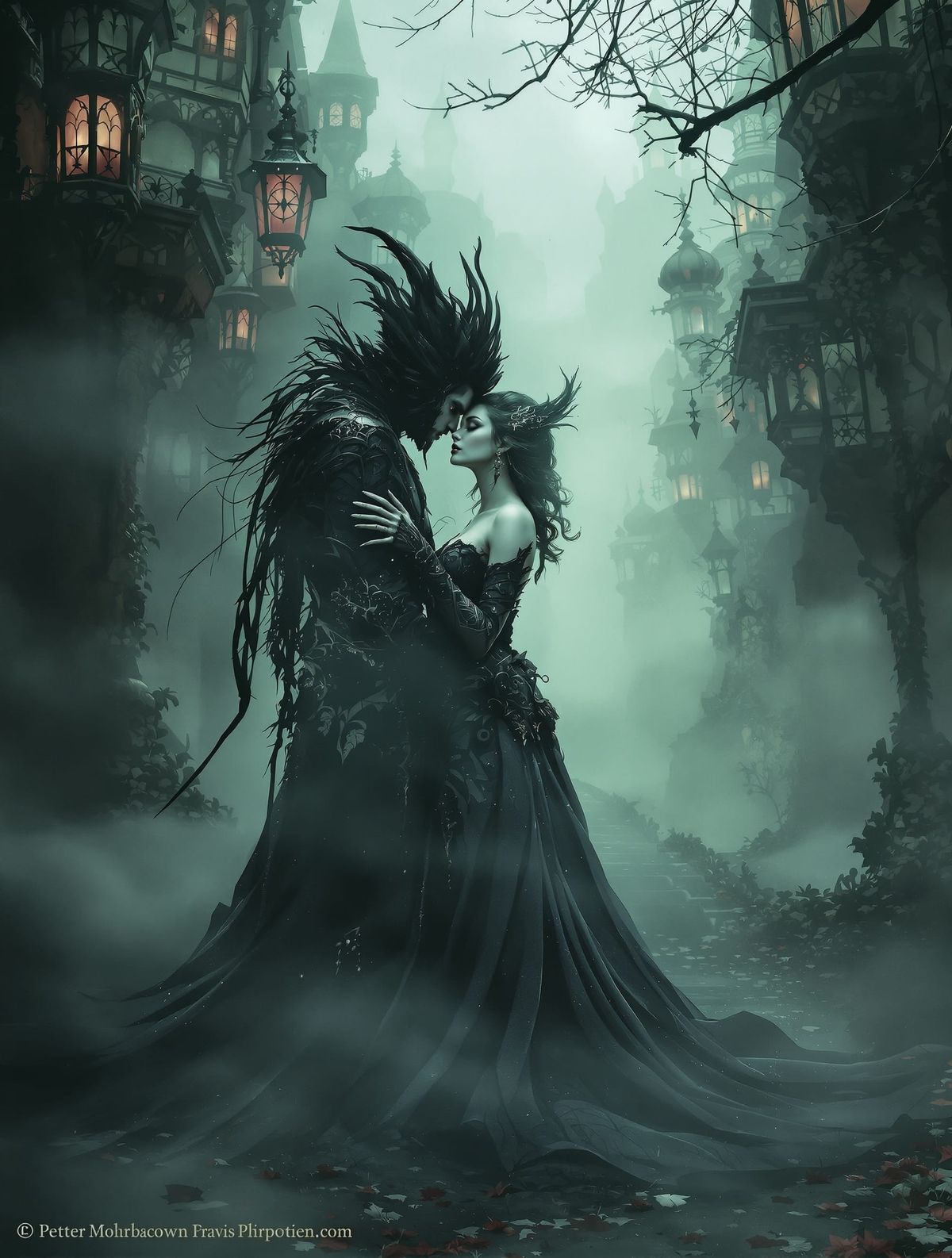 This image shows a fallen angel and an empress in a foggy, gothic town. The scene blends dark Victorian fashion with romantic, cinematic lighting and intricate, whimsical details.