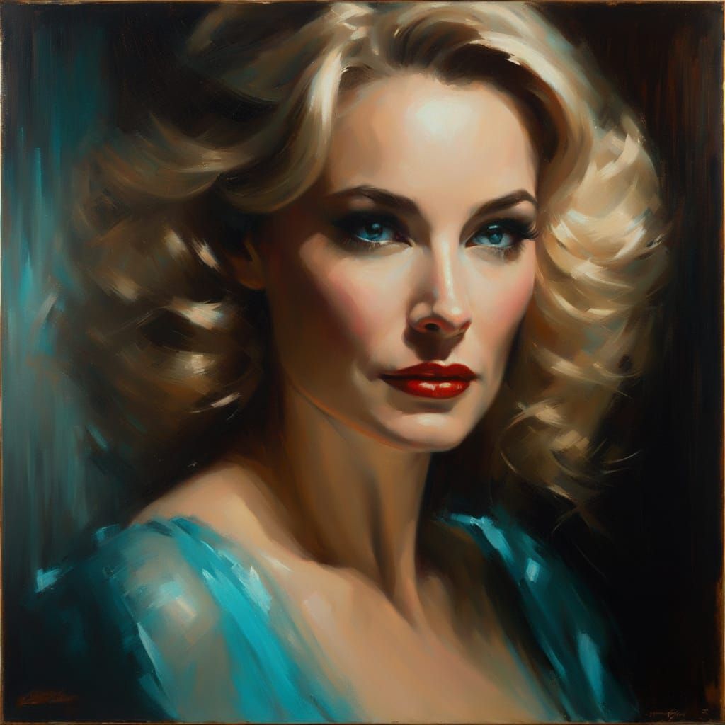 A striking image of a beautiful woman in a turquoise gown, rendered in an impressionistic film noir style. The oil painting captures her apprehensive expression with exquisite detail.