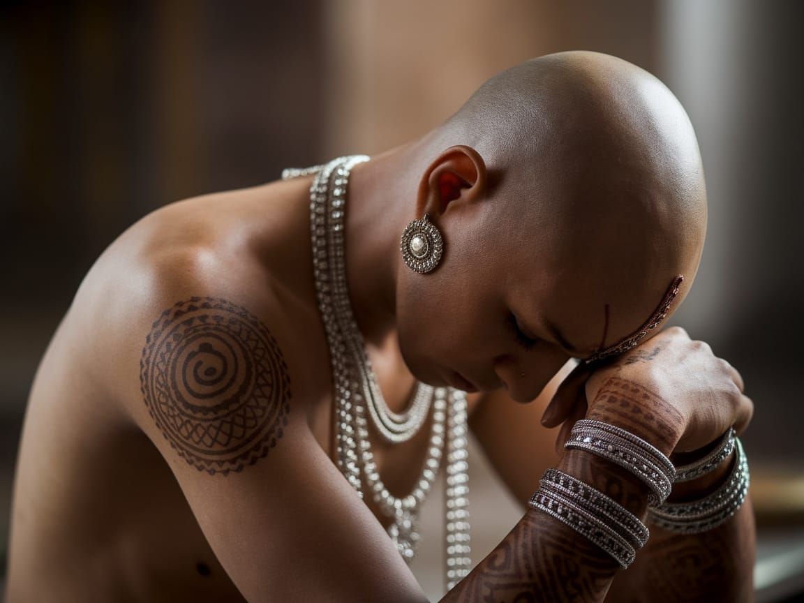 This intimate portrait shows a shaved, henna-adorned Indian man in a state of deep shame and vulnerability, adorned with traditional jewelry and a striking bindi. The soft lighting highlights the intricate details of his skin and jewelry, drawing attention to his emotional expression.