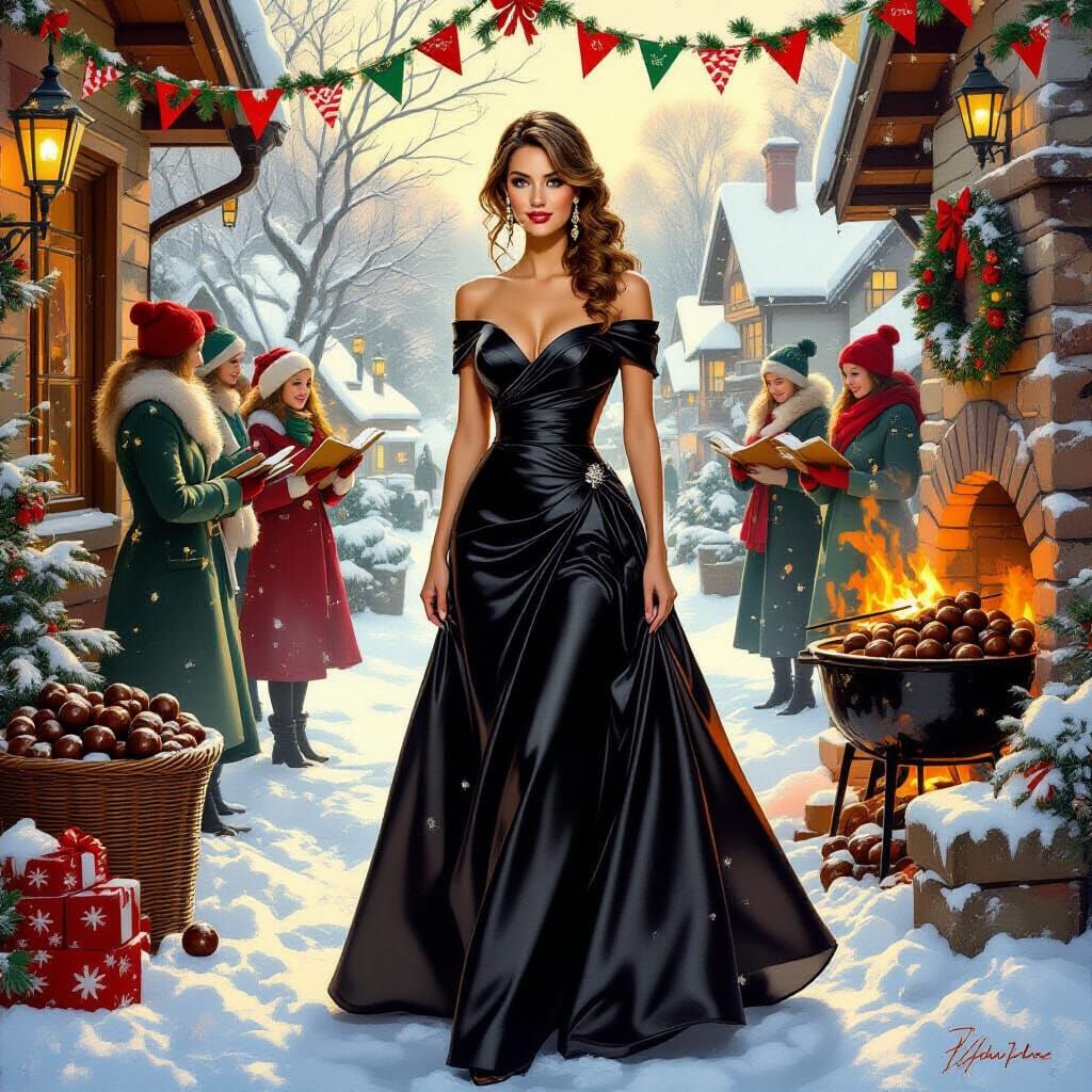 This oil painting captures a beautiful woman in a satin morning dress, surrounded by Christmas carolers and festive decor. Evokes vintage charm with soft golden hour light.