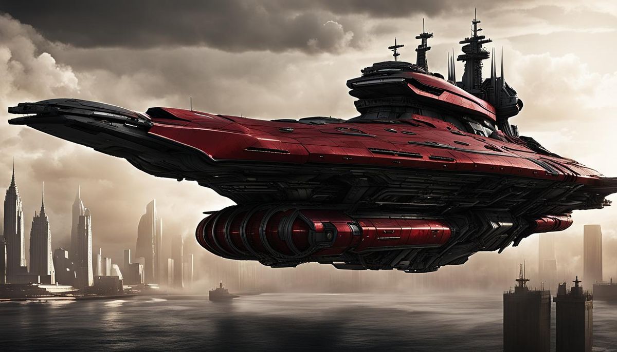 This image shows a colossal Imperator-class space battleship ready for battle. The vessel has a dark metallic hull with crimson accents and is armed with supermassive cannons and fighter craft. Sharp focus and natural lighting.