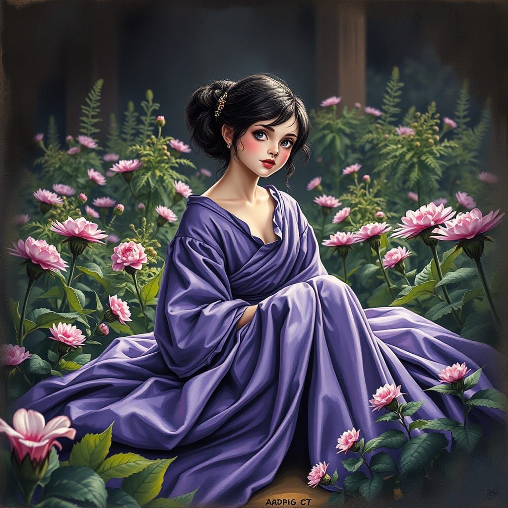 A detailed charcoal drawing of a young girl in a violet robe sitting in a garden. The artwork blends gouache and watercolor styles with layered textures, cinematic lighting and rich colors.